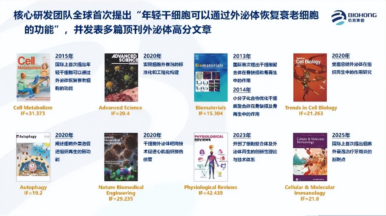 作为国内再生医学与合成生物领域标杆企业,佰鸿集团在外泌体科研领域长期领跑,率先取得多项里程碑式原创突破。集团在国际上首次提出年轻干细胞通过外泌体携带 miRNA 修复衰老细胞功能的核心原创理论,较早布局外泌体再生护肤赛道,开拓生物科技护肤全新应用场景。