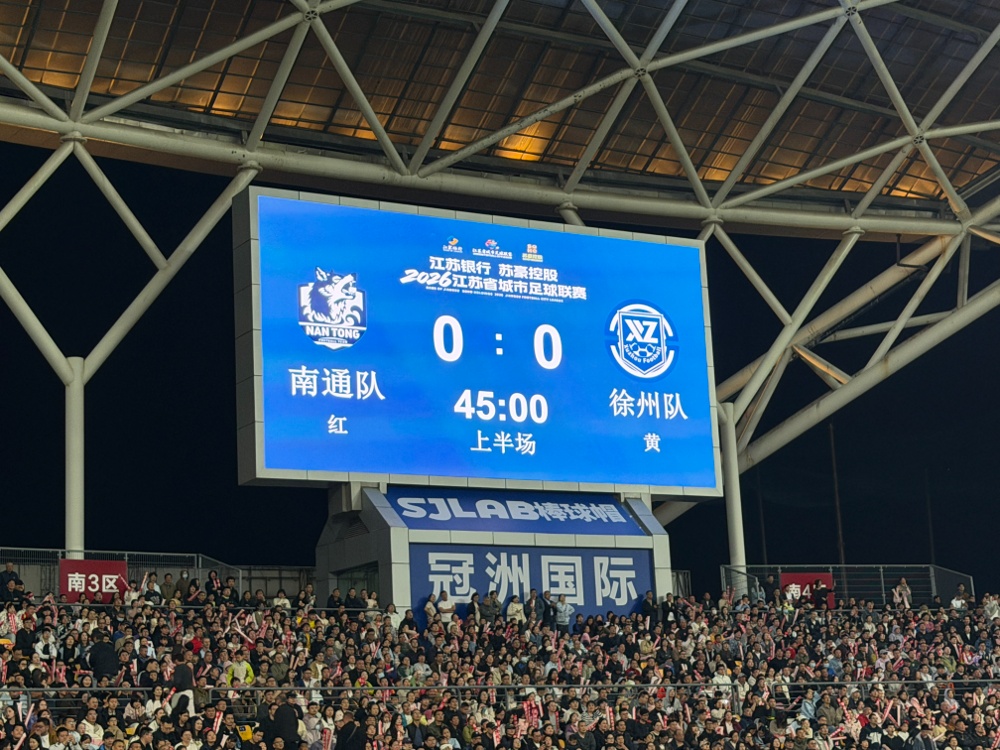 交汇点讯 4月25日晚,2026江苏省城市足球联赛(“苏超”)第二轮,南通队在主场南通体育会展中心体育场迎战徐州队。上半场战罢,两队0比0握手言和。