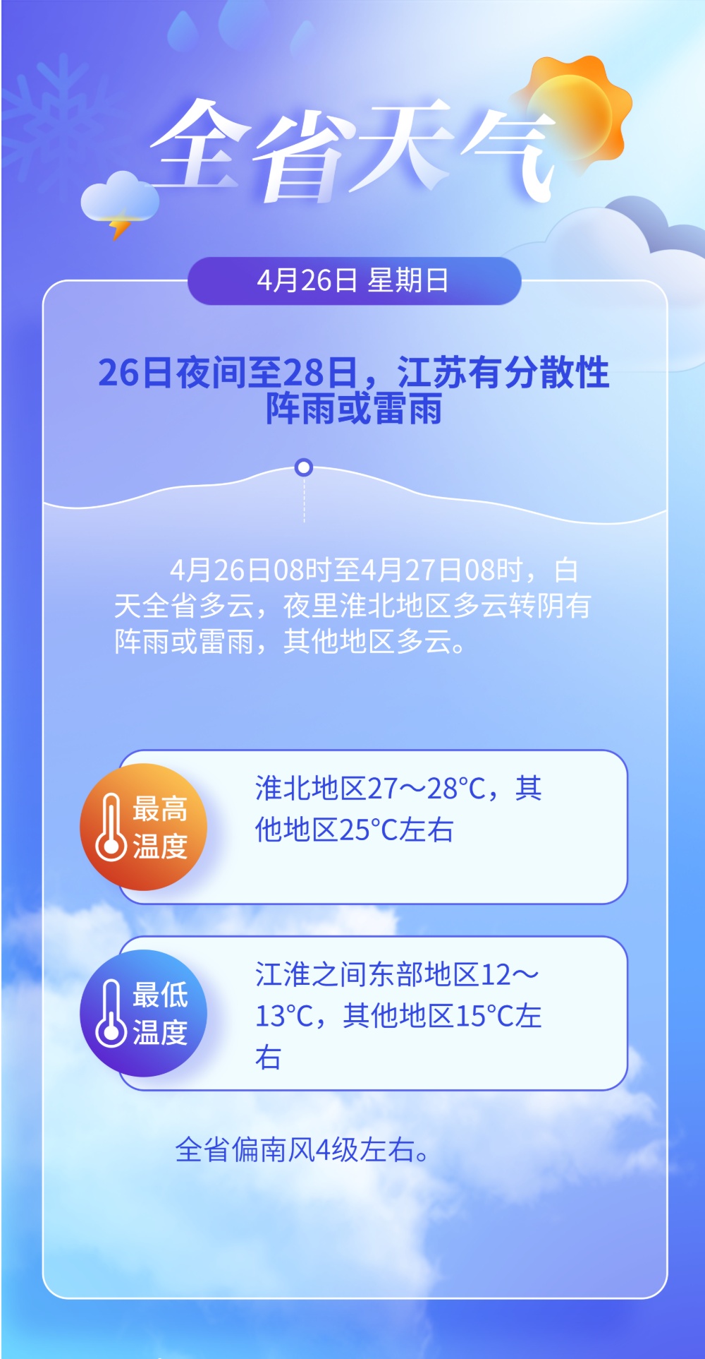 09 26日夜间至28日,江苏有分散性阵雨或雷雨