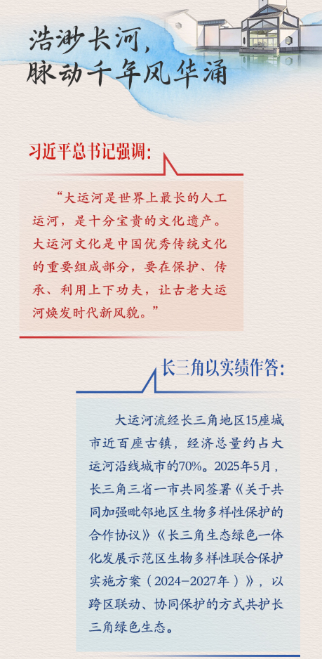 “河”以长三角?答案在对大运河的保护、传承及利用上:运河沿线生态切实改善、文化不断传承发展、产业持续迭代升级,清澈河水、优美岸线,生态改善与文化繁荣,最终汇聚成可感可及的创新活力与人间烟火。