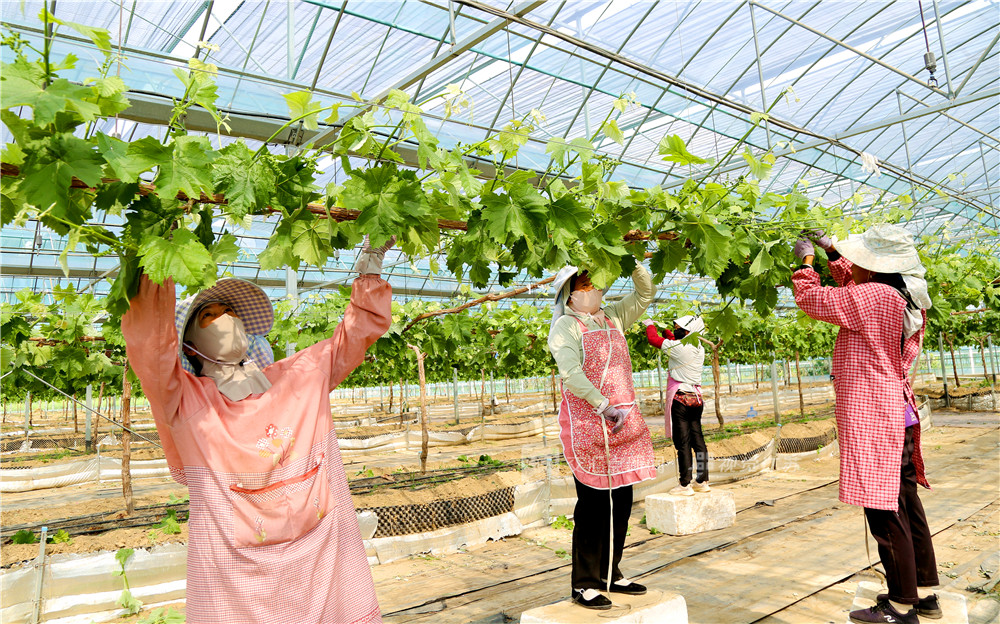 (特约摄影 张格波 9:07摄 11:44上线)4月26日,在江苏省睢宁县梁集镇农业科技示范园,红珊瑚葡萄种植专业合作社智能连体大栅里,果农正为阳光玫瑰葡萄捆扎果枝,剪去分枝等管护,一派春天繁忙景象。