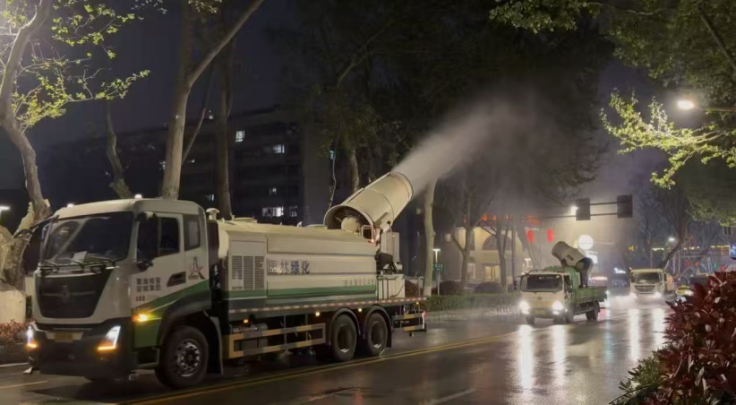 2019年起,市绿化园林部门于4—6月飘絮季的夜间,采用高射程喷雾机将果毛吹落,经多年实践总结,形成雾炮车吹絮、洒水车冲絮、扫地车扫絮的“吹冲扫”物理除絮模式。