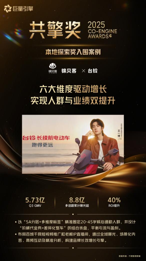 摘得“共擎奖”的标杆案例,源自锦贝客与台铃电动车在2025年Q3的一次深度协同。面对两轮电动车行业白热化的存量竞争,双方从渠道结构、内容矩阵到数字化运营进行了系统性的重构,通过“人、货、场”三大维度的精细化组合策略,实现了品牌人群资产与销售业绩的双重跃升。
