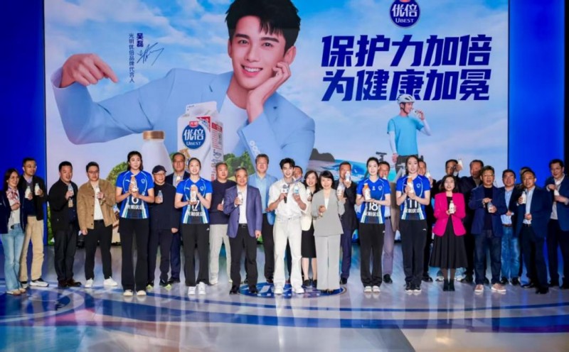 光明优倍品牌代言人吴磊,光明乳业党委书记、董事长黄黎明,光明乳业党委副书记、总裁贲敏,上海光明优倍女排冠军队员,以及媒体、经销商、合作伙伴、粉丝代表齐聚现场,共同举杯“干奶”,见证光明乳业又一鲜活高光时刻。