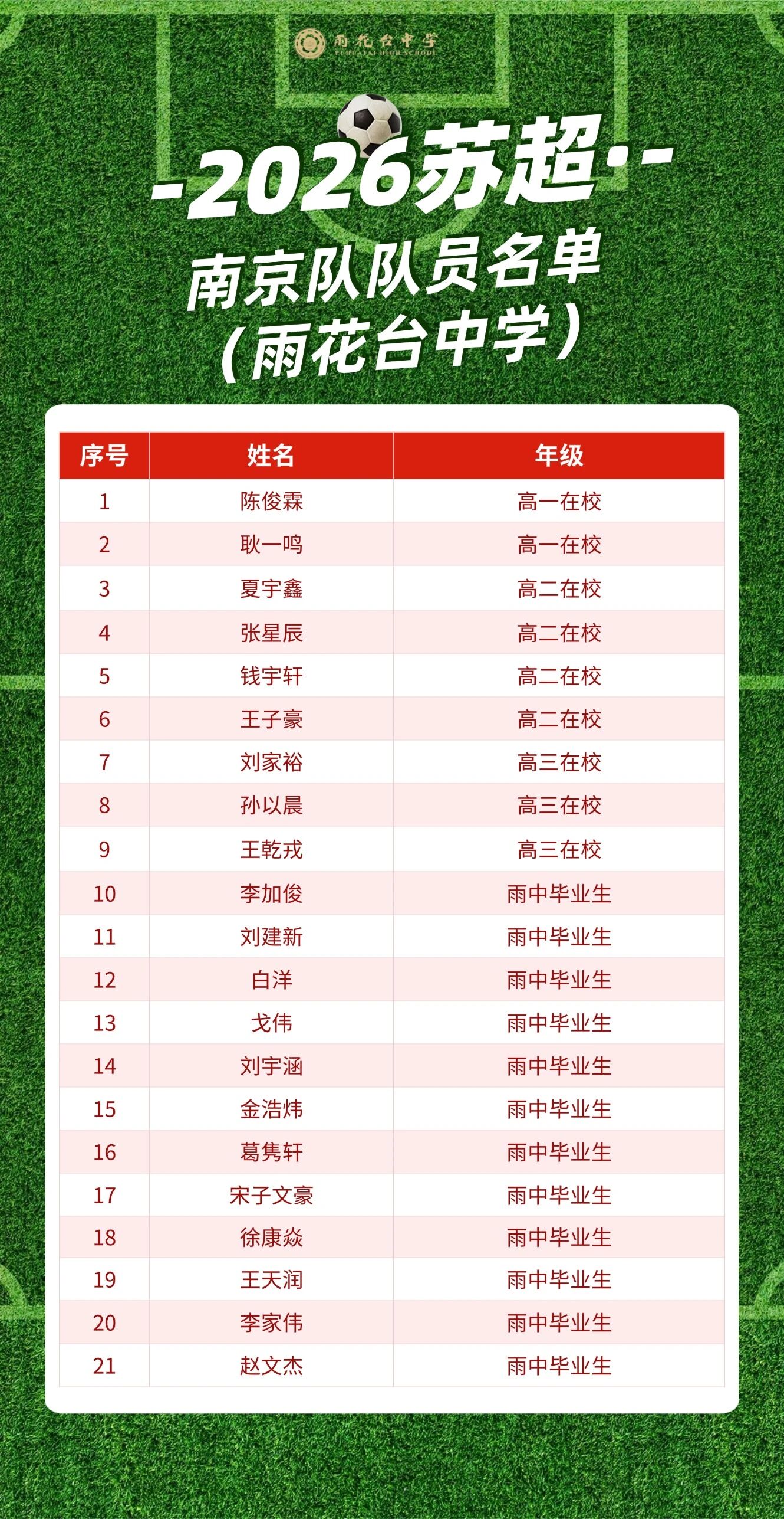 据了解,此次,南京市雨花台初级中学的12名初三应届毕业生凭借省运会保障名额政策,可免试直升南京市雨花台中学读高中。据悉,南京市雨花台中学在校生和毕业生有21人在2026“苏超”南京队大名单中,其中9名队员是雨花台中学的在校生,年龄最小的仅16岁。