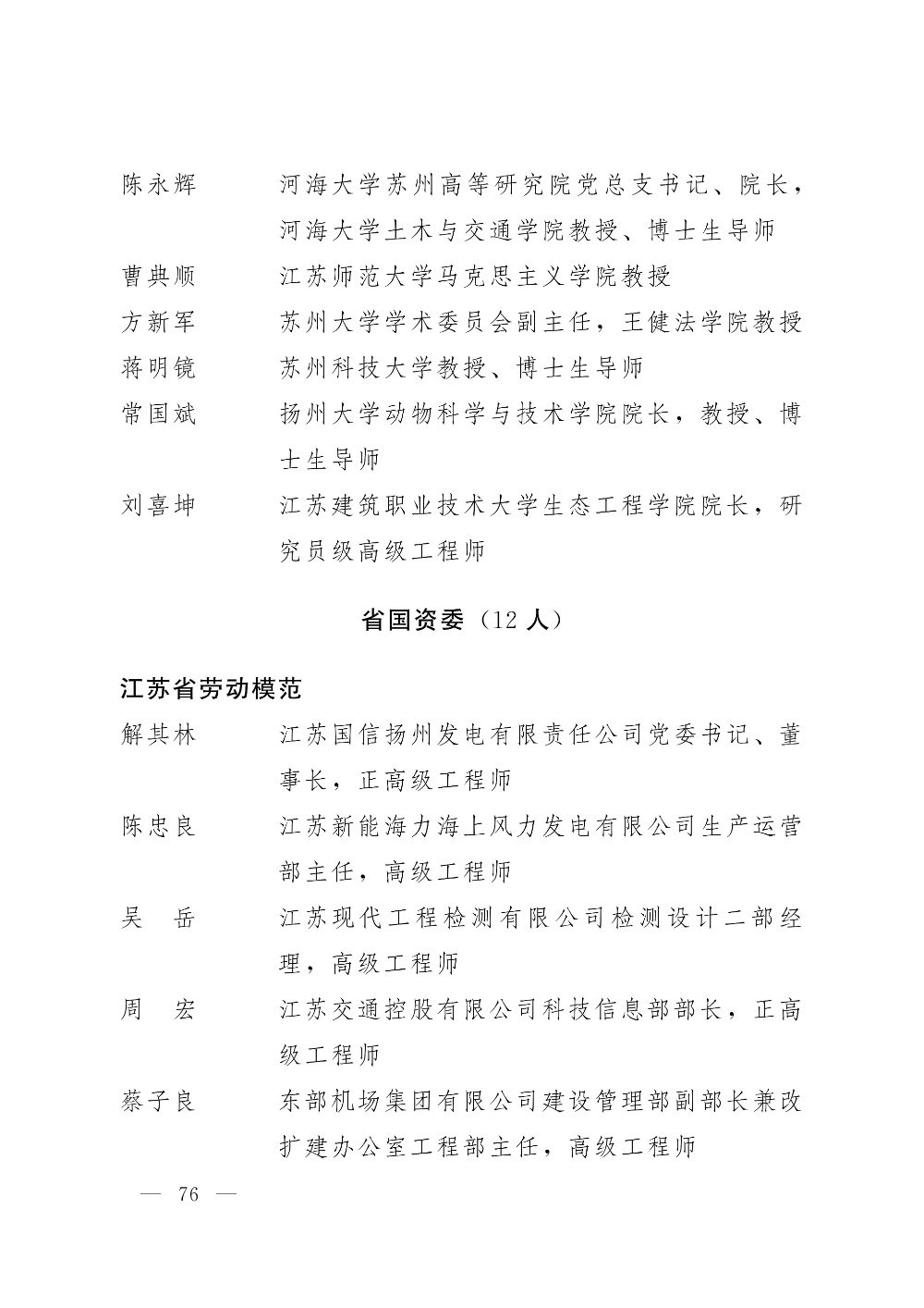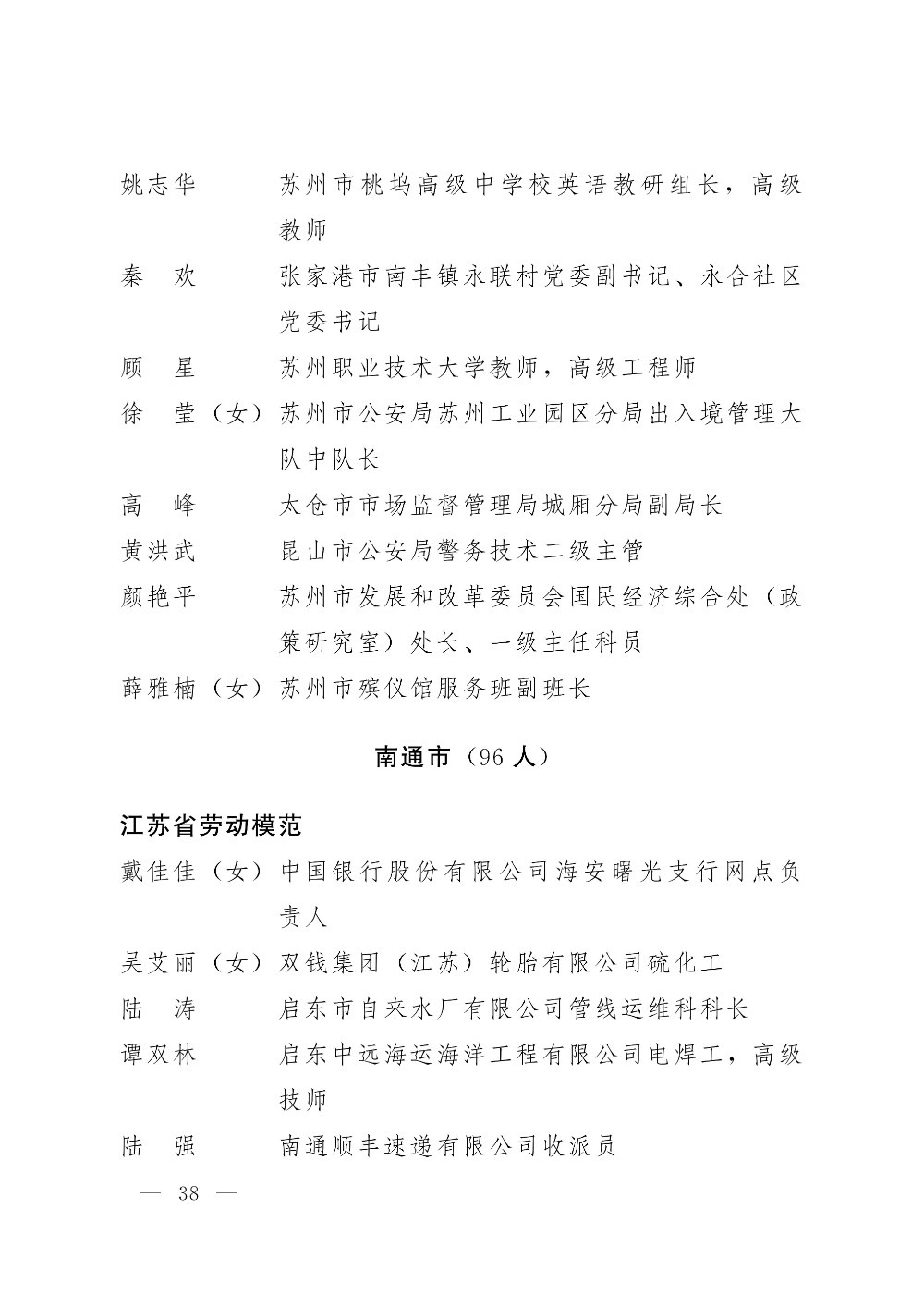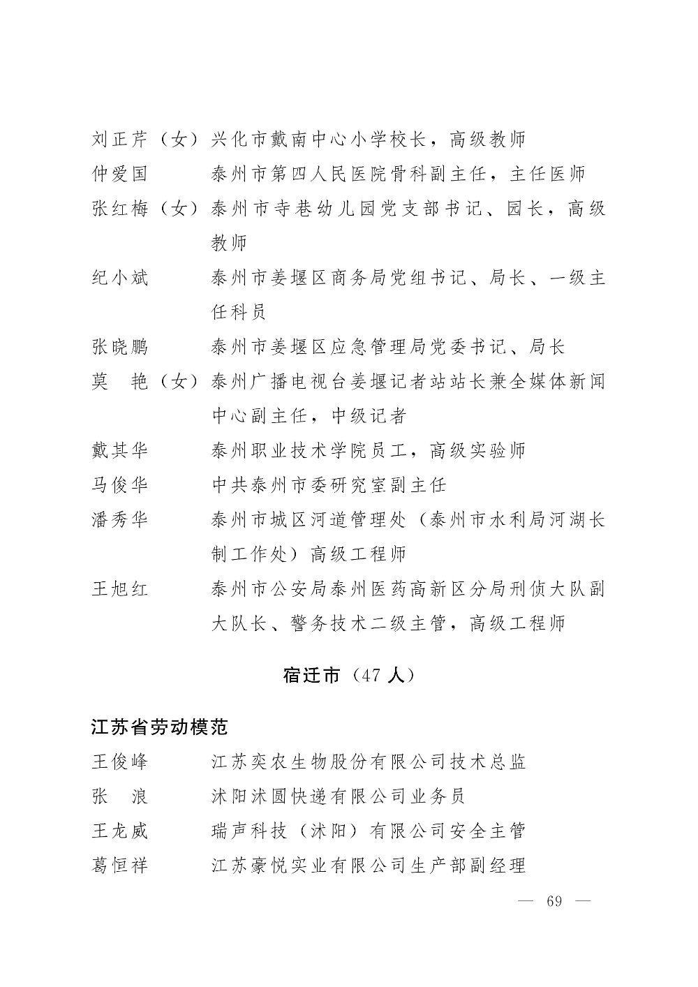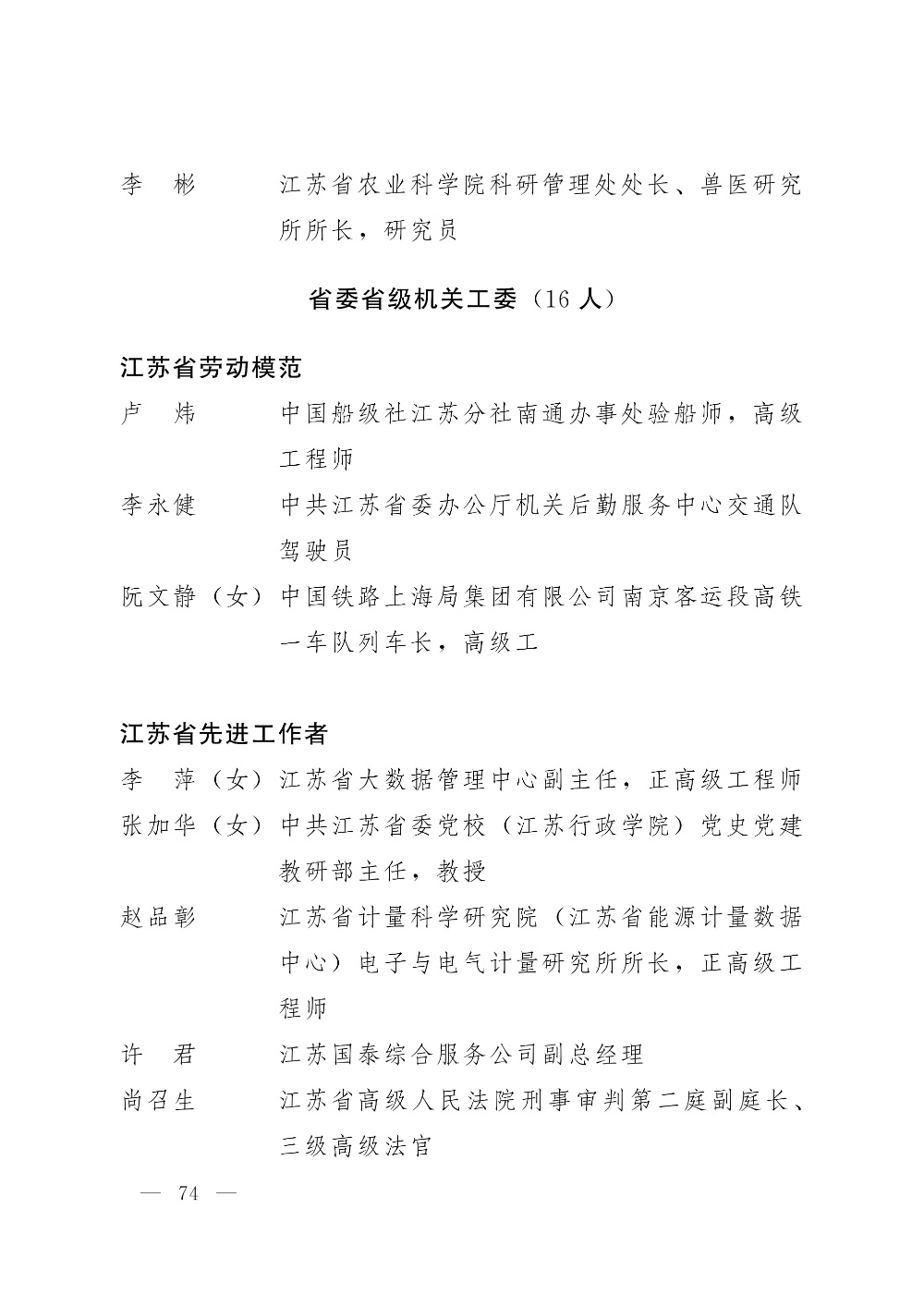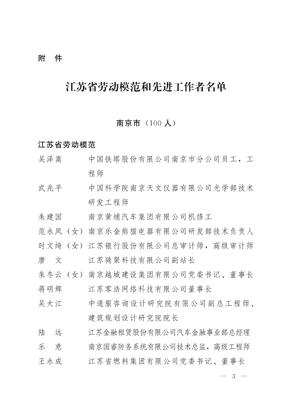 近年来,在以习近平同志为核心的党中央坚强领导下,省委、省政府认真贯彻习近平总书记重要指示精神和党中央决策部署,团结带领全省人民砥砺奋进、攻坚克难,圆满完成“十四五”主要目标任务,推动中国式现代化江苏新实践迈出新的坚实步伐。在这一奋斗历程中,全省各行各业涌现出一大批敬业奉献、锐意进取、忘我拼搏、敢为人先的先进模范人物。他们以实际行动生动诠释了劳模精神、劳动精神、工匠精神的时代内涵,充分彰显了新时代江苏劳动者的精神风貌和时代风采。为表彰他们的突出贡献,进一步凝聚起团结奋进的强大力量,省委、省政府决定,授予吴泽嵩等726人江苏省劳动模范称号,授予耿丽红等274人江苏省先进工作者称号。