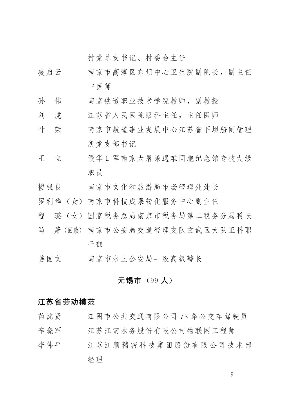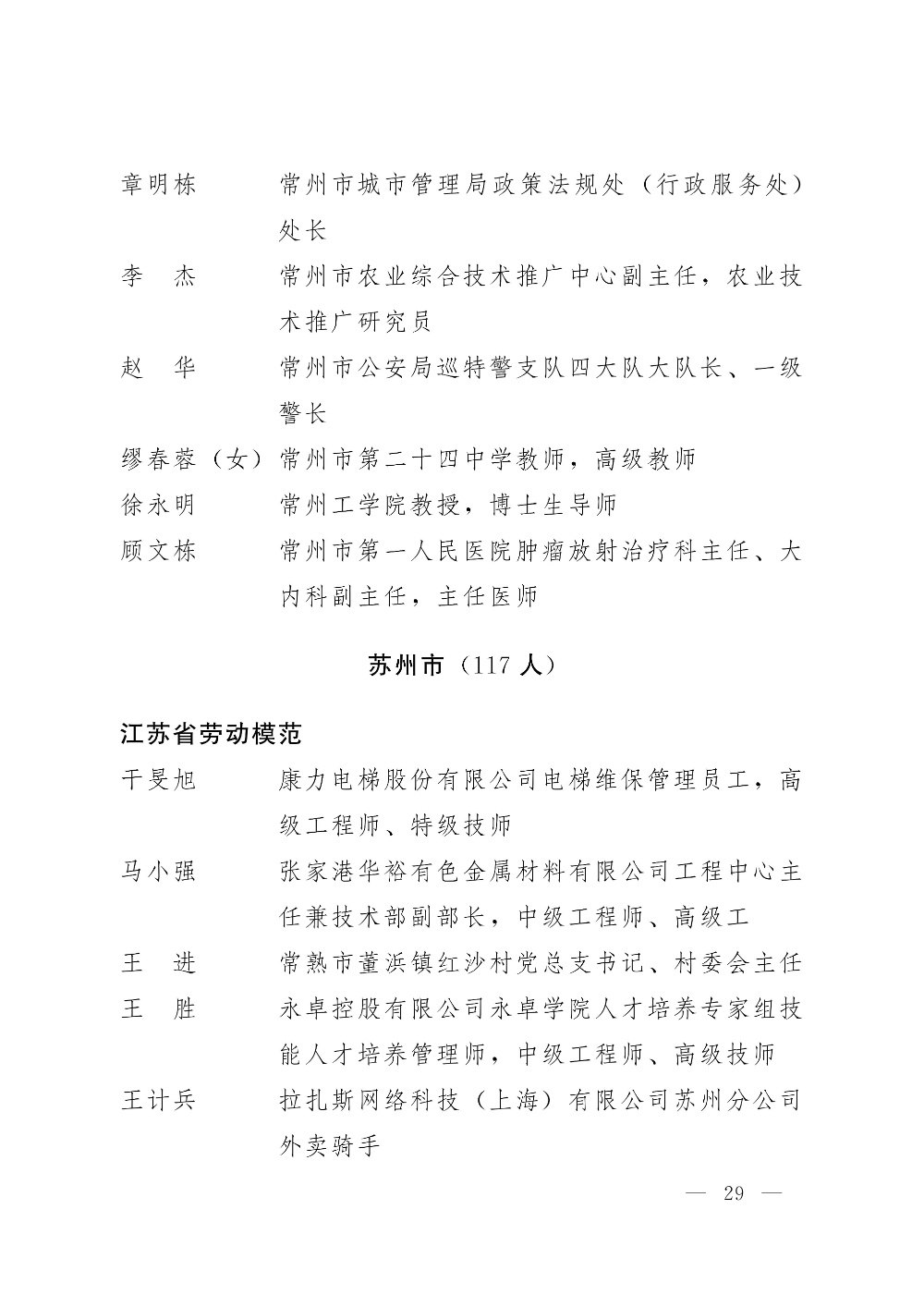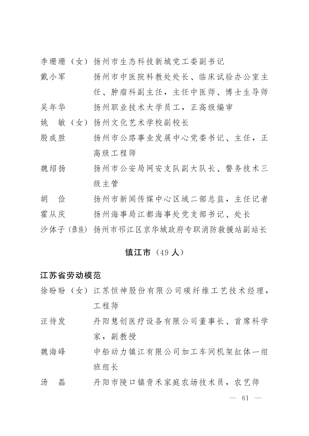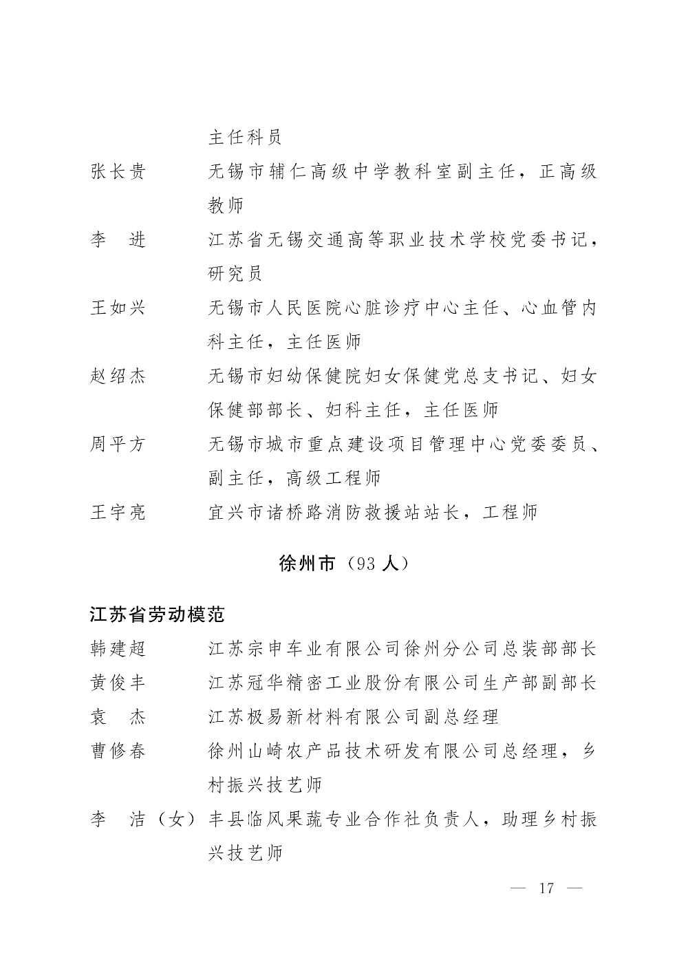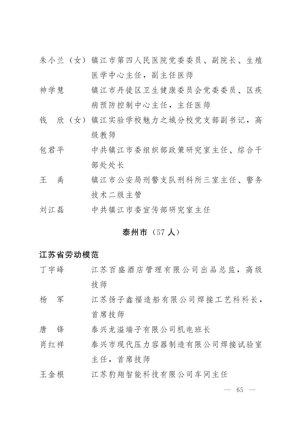 近年来,在以习近平同志为核心的党中央坚强领导下,省委、省政府认真贯彻习近平总书记重要指示精神和党中央决策部署,团结带领全省人民砥砺奋进、攻坚克难,圆满完成“十四五”主要目标任务,推动中国式现代化江苏新实践迈出新的坚实步伐。在这一奋斗历程中,全省各行各业涌现出一大批敬业奉献、锐意进取、忘我拼搏、敢为人先的先进模范人物。他们以实际行动生动诠释了劳模精神、劳动精神、工匠精神的时代内涵,充分彰显了新时代江苏劳动者的精神风貌和时代风采。为表彰他们的突出贡献,进一步凝聚起团结奋进的强大力量,省委、省政府决定,授予吴泽嵩等726人江苏省劳动模范称号,授予耿丽红等274人江苏省先进工作者称号。
