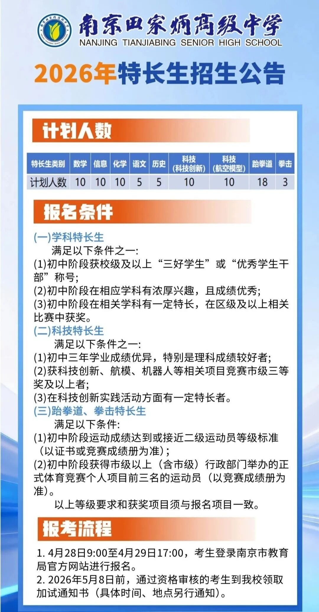 4月26日下午,南京田家炳高级中学校园开放活动暨招生咨询会上,该校校长唐云兰介绍,2026年田高中招收学科特长生40名,科技特长生20名,招生范围是原市区。学科特长生中包括数学、化学、信息各10名,语文、历史各5名。值得注意的是,学科特长生中的信息特长生,较2025年增加了5个名额。