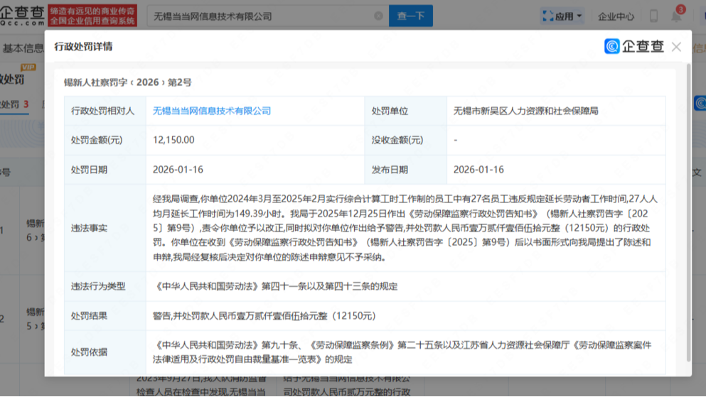 当当网公司因员工超长加班被罚 人均月加班近150小时