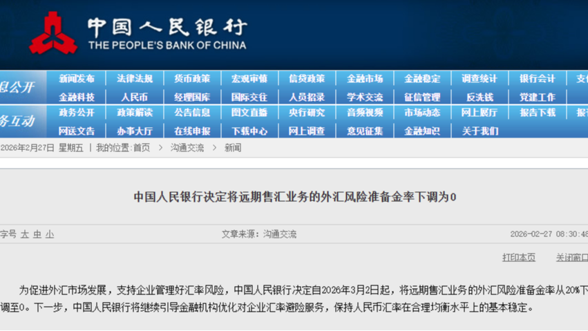 央行大动作!外汇风险准备金率下调至0 企业远期购汇成本直降