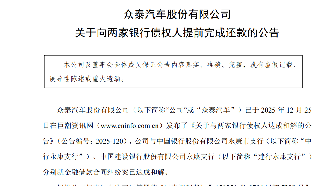 提前还款!众泰汽车宣布偿还近4亿元债务