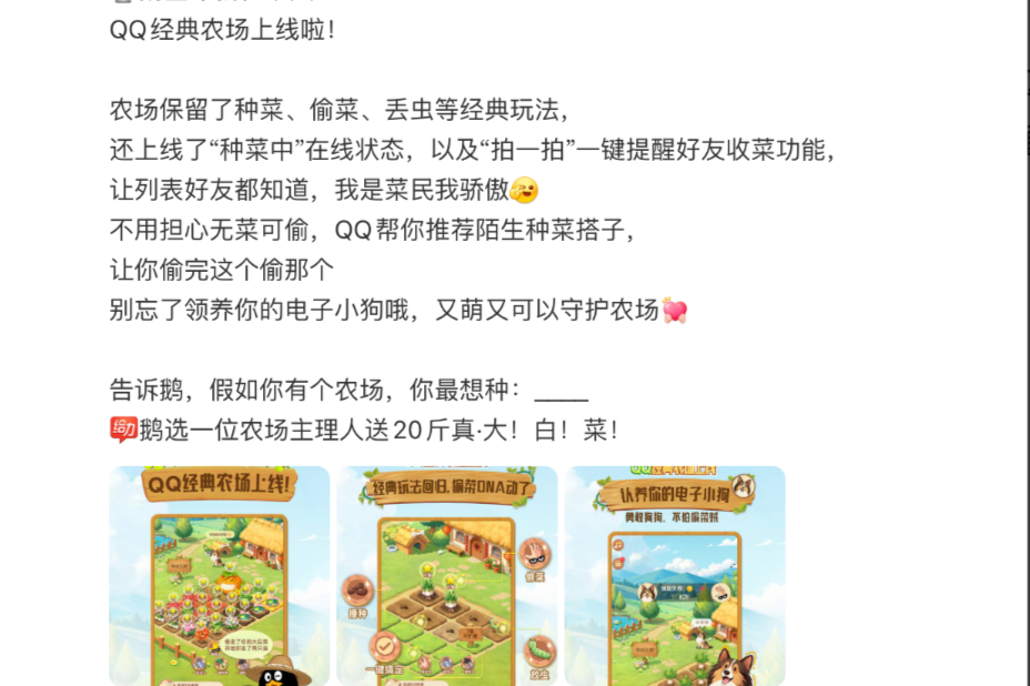 爷青回!QQ农场今日回归,偷菜快乐重启
